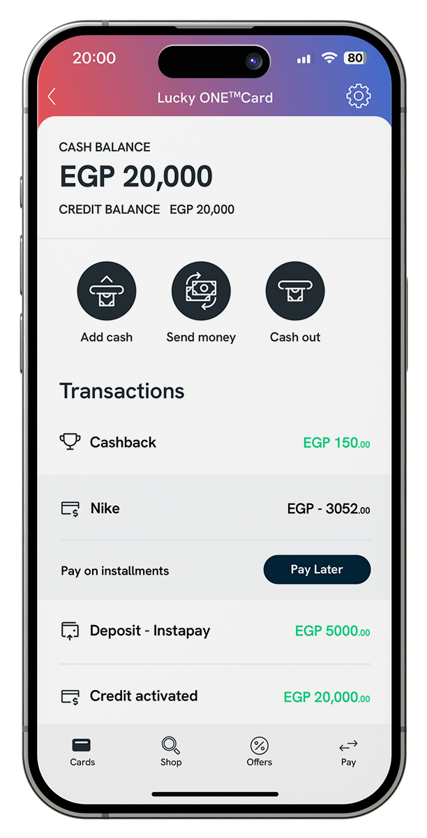 Lucky ONE card gives you a simple and instant approval on up to 20,000 EGP credit line for qualifying cardholders, providing you with the financial flexibility.